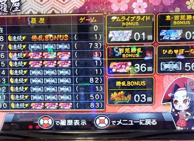 有利切れて最初のあたりで百花繚乱ボーナス240枚くらいスタートでSSまであげてサムライブライド入れて萌え入り状態で完走1600枚くらいでした